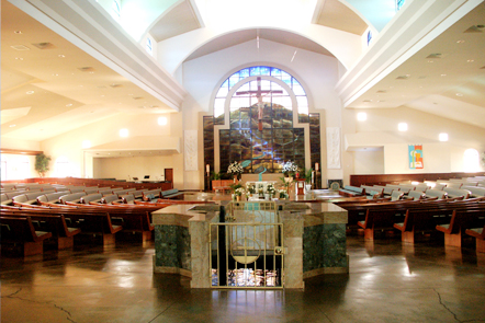 St. Rose of Lima serves a growing Catholic Diocese in Reno, Nevada. With the Rocky Mountains in the background near Donner Pass, it stands in a scenic location, which is portrayed in its stunning stained glass window. This dramatic interior is reminiscent of Mount Sinai where Moses struck a rock to release water. The church was dedicated in 2003 by the founding pastor, Father Tom Donnelly and Bishop Phillip Straling.